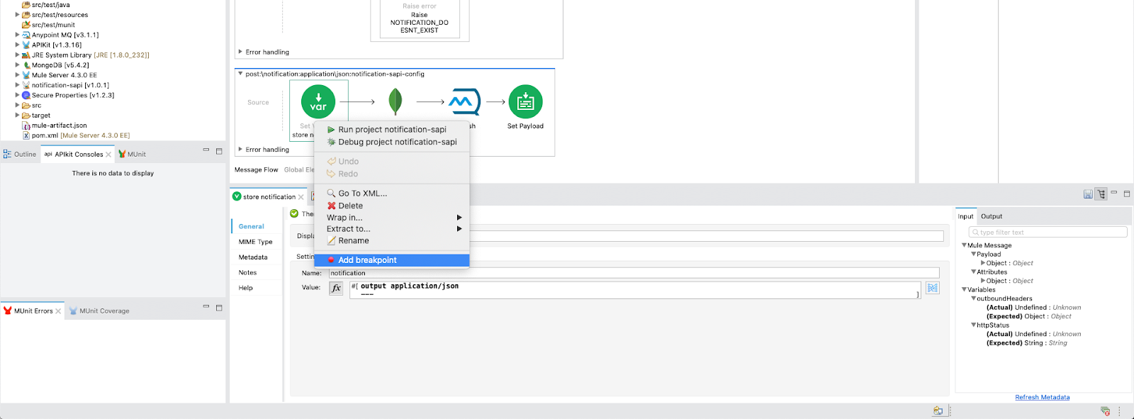Next, we are going to walk through these projects step by step. First set a breakpoint on our notification-sapi.xml file. Please right-click on the Set Variable "store notification" in the POST Notification flow. Click on "set breakpoint" at the bottom of the dropdown.
