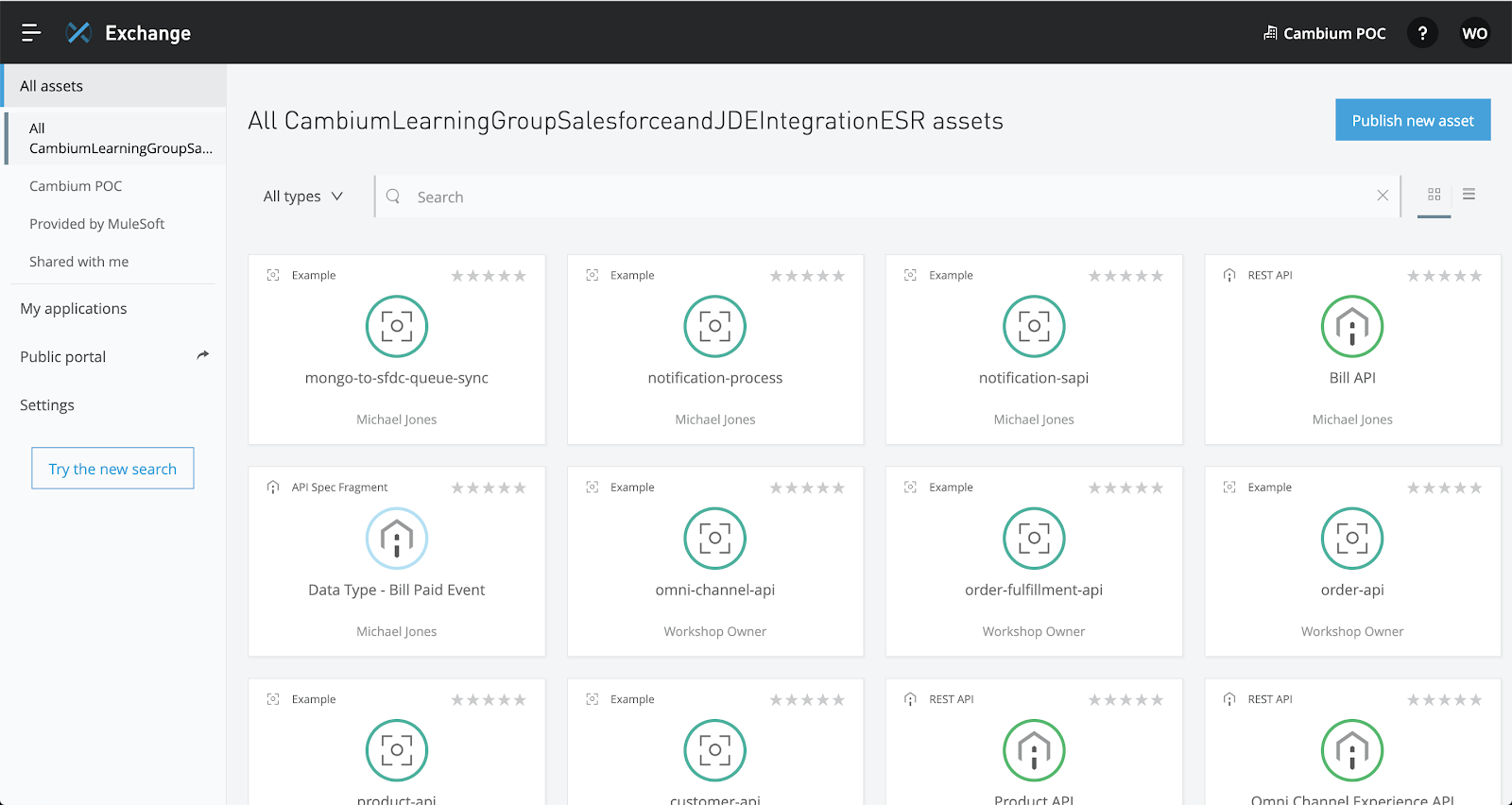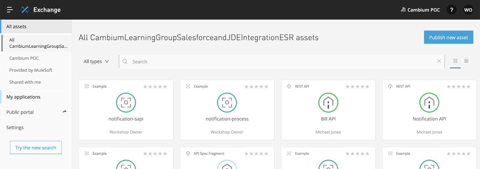 Begin by navigating to the Anypoint Exchange to view existing assets within the organization and provided by MuleSoft. Use the menu on the left hand side to view assets provided by MuleSoft or in a specific business group. Use the search bar to find relevant connectors, templates, and examples.
