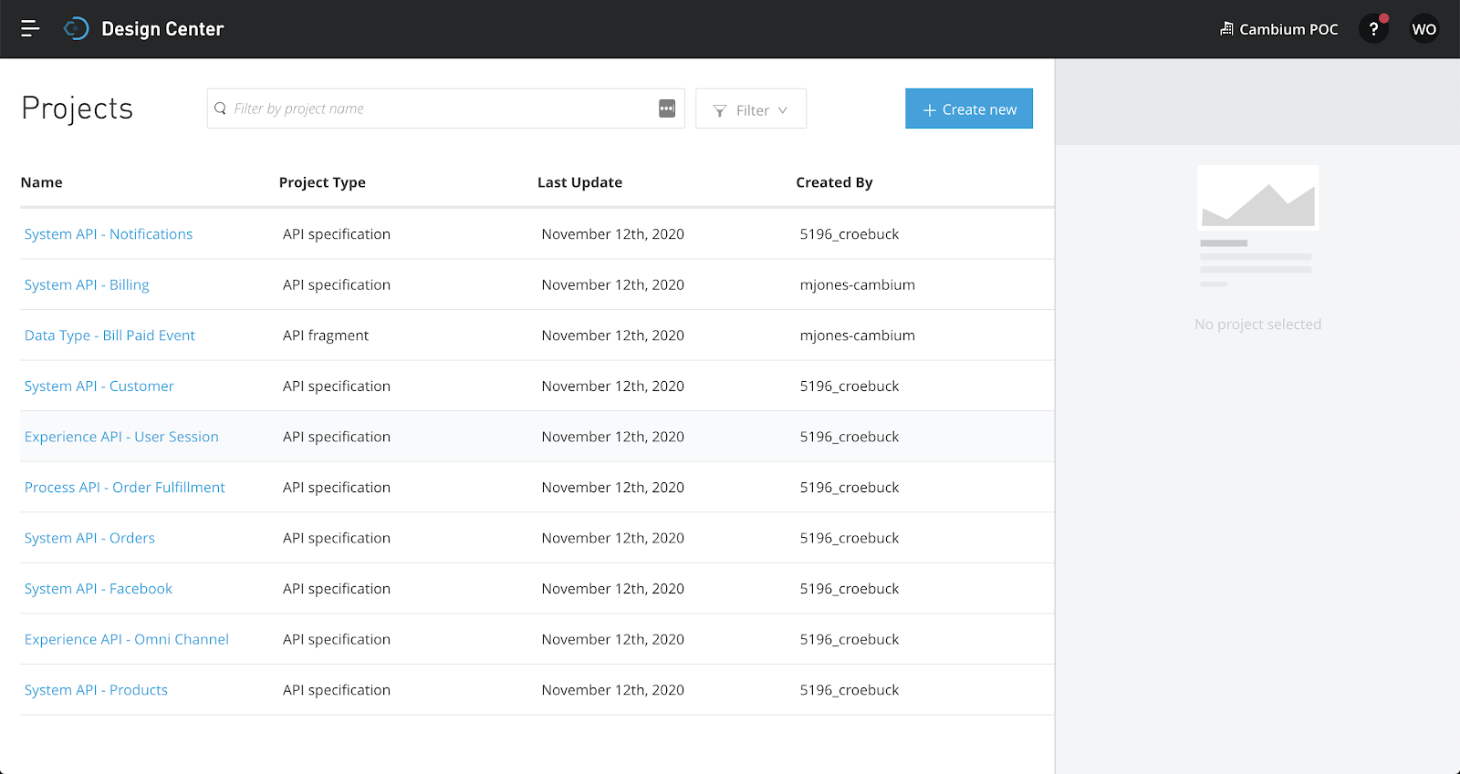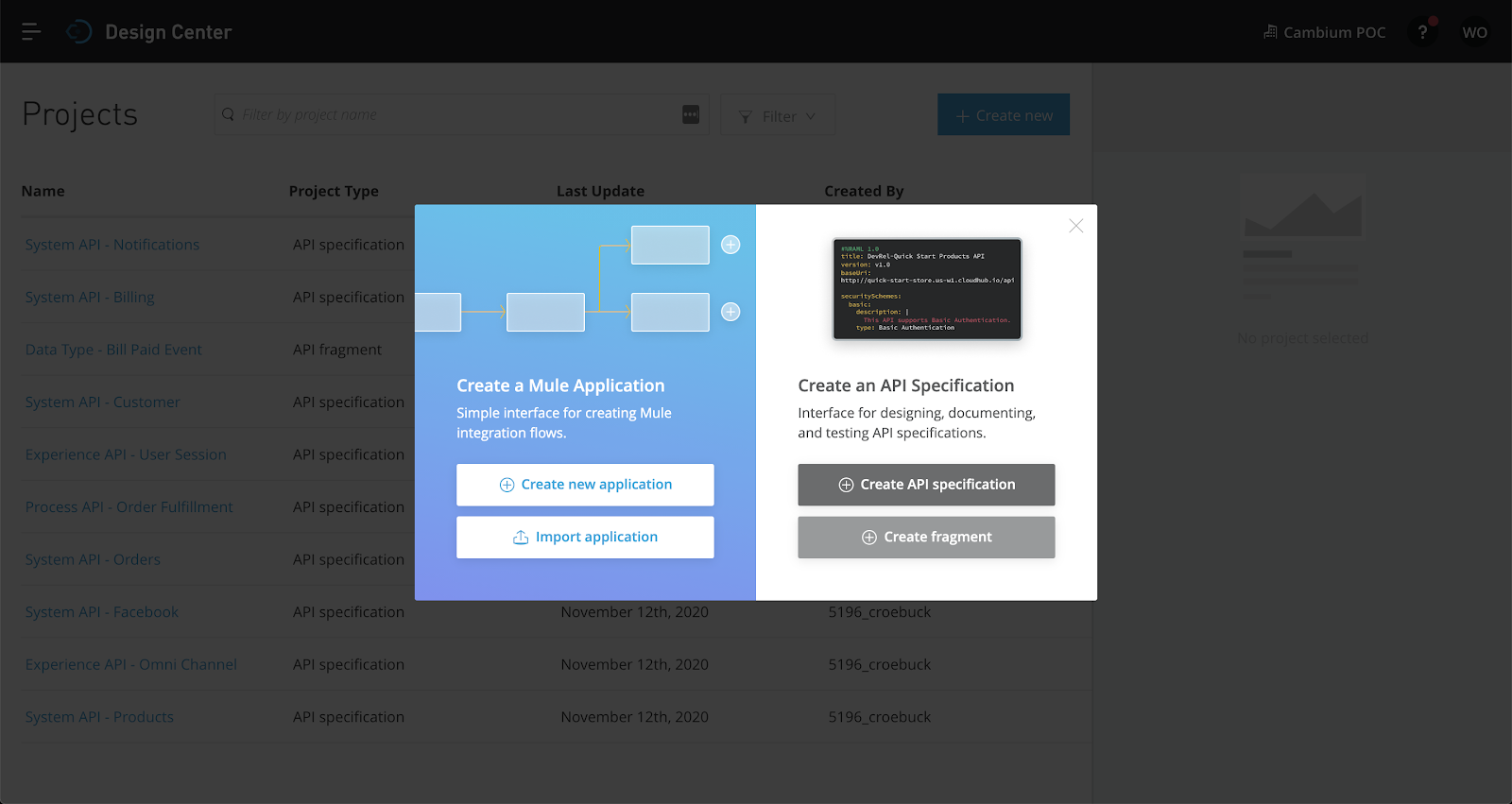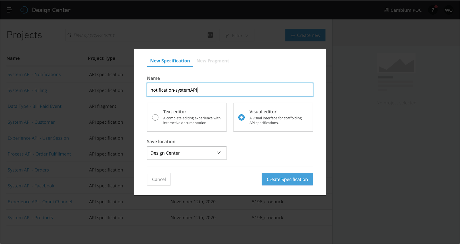 Select "Create New", "Create API Specification"