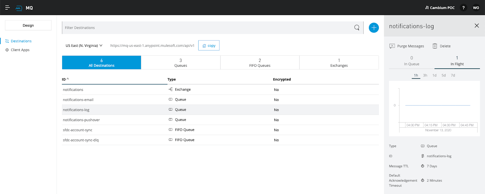 Next, you will step through the notification-email-queue flow. Once you have entered that flow, you can go back to your MQ and see that there will be 1 message "In Flight" in your "initials-notifications-email" queue.
