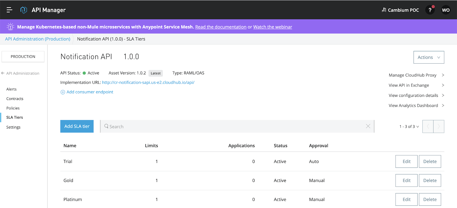 To enforce SLA tiers, you need to apply a rate-limiting or throttling policy that is SLA-based. These policies require all applications that consume your API to register for a specific tier. Their client credentials will be required for each API call so that Anypoint Platform can properly enforce the contracted tier.