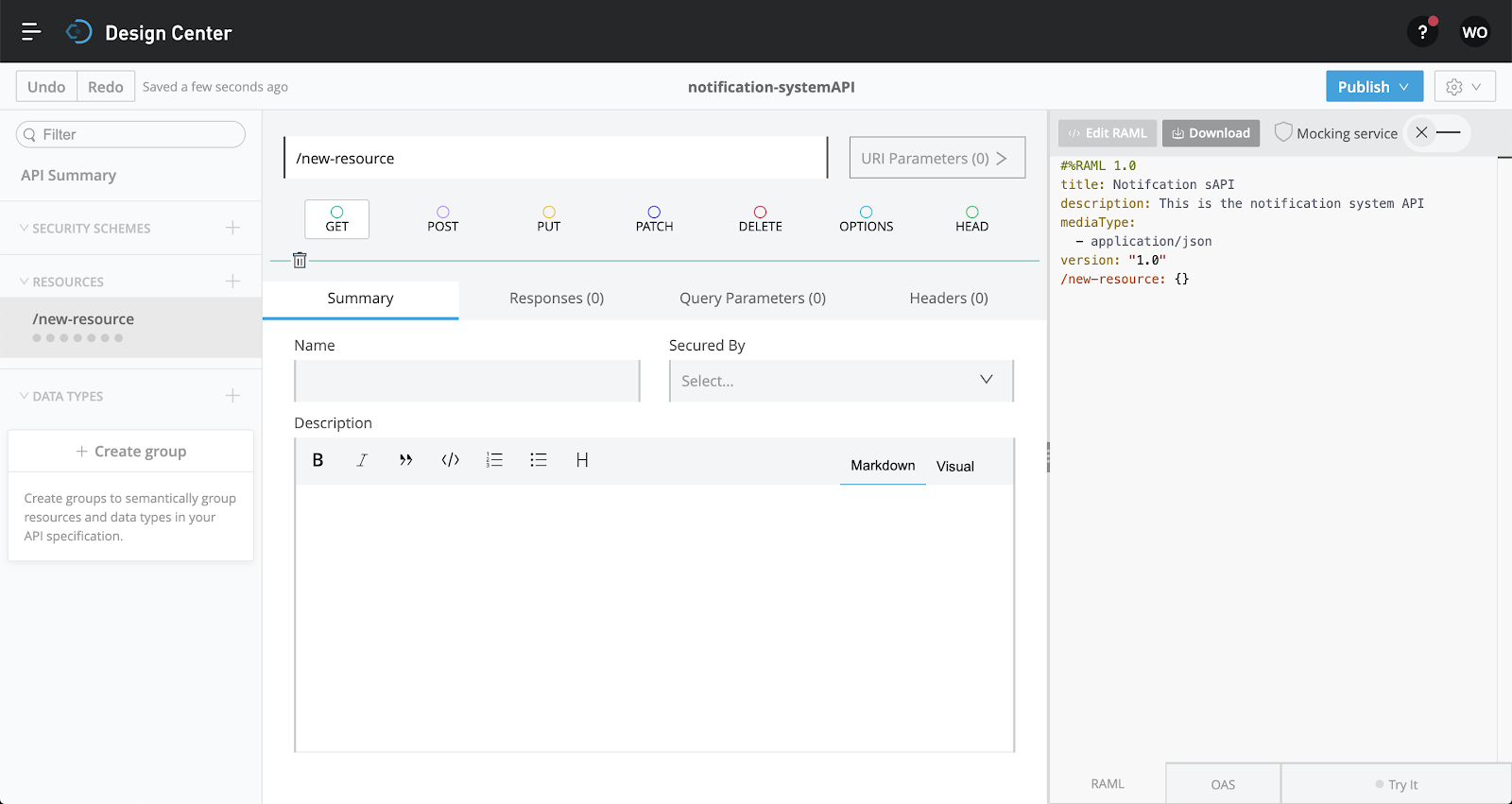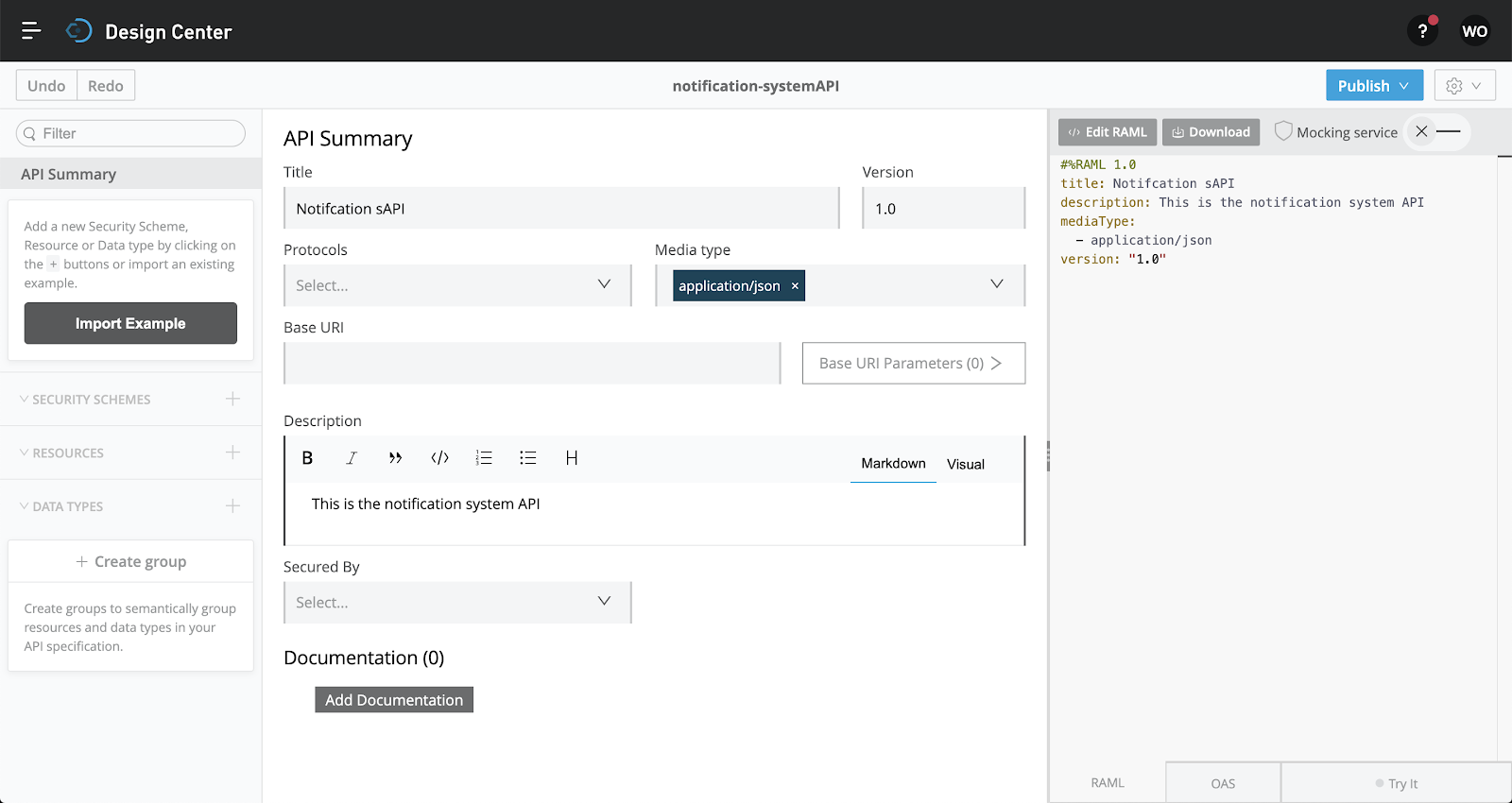 Title the API, add Version, and description using the boxes. You will notice that RAML is populating in the right hand column. Toggle with OAS on the bottom of the page on the right.