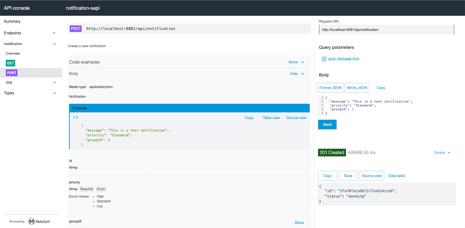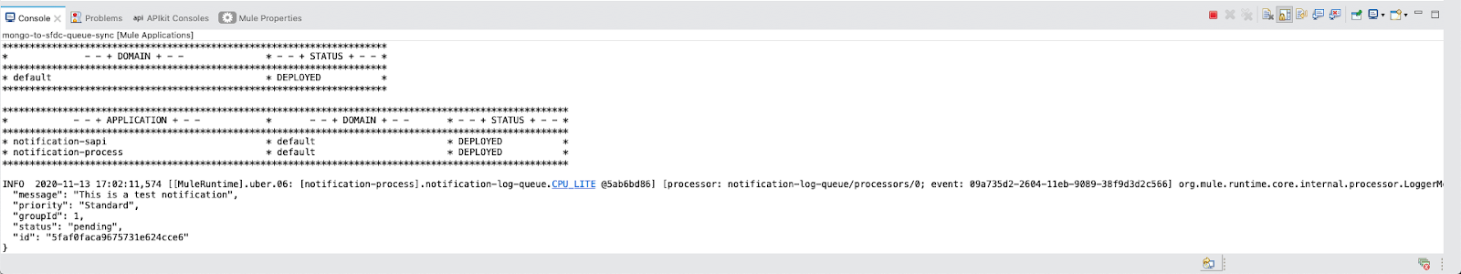 Move back to Studio and continue stepping through the API. Please note that once you have made it through the noticiation-email-queue flow that you will receive an email to your inbox if you had added it in the transform message earlier. Move back to your API Console and you will get a 201 Created with an ID number and status.