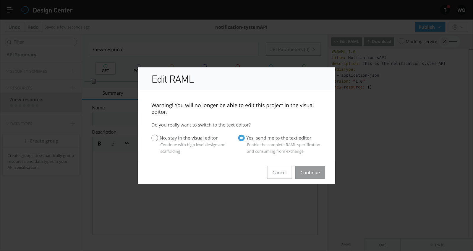Now that we have seen the visual editor, we will move to the code editor to finish the specification. Select "Edit RAML" on the upper right side. When the pop-up appears, select "Yes, send me to the text editor" and "Continue"