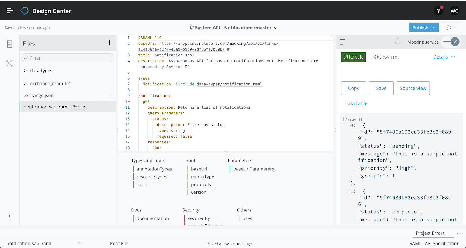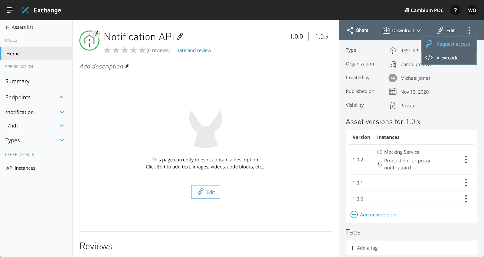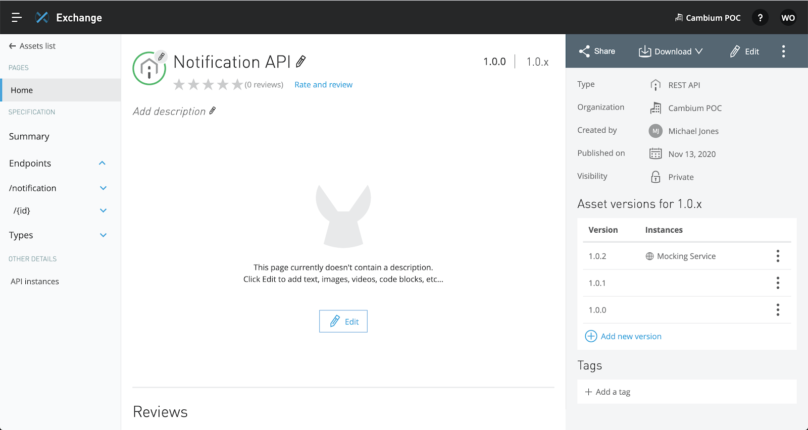 Once the API is published, navigate to exchange by clicking the link in the pop-up. This will bring you to the API page where we can add a description of the API and use the mocking service.