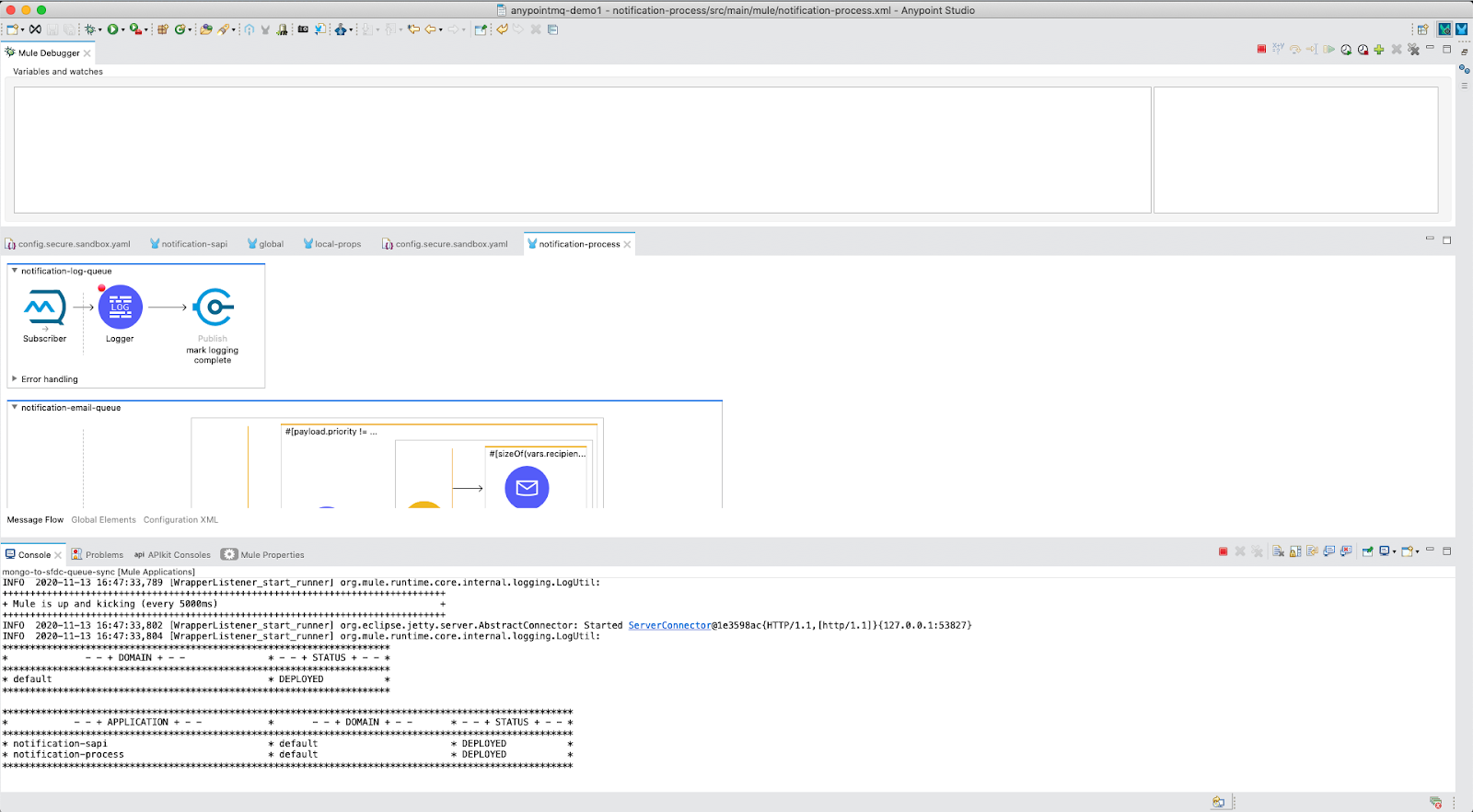 Now, navigate back to the notification-process.xml file. We will be setting two breakpoints on this project. First is on the Logger in the notification-log-queue. The second is on the Set Variable titled "store messageId" in the notification-email-queue.