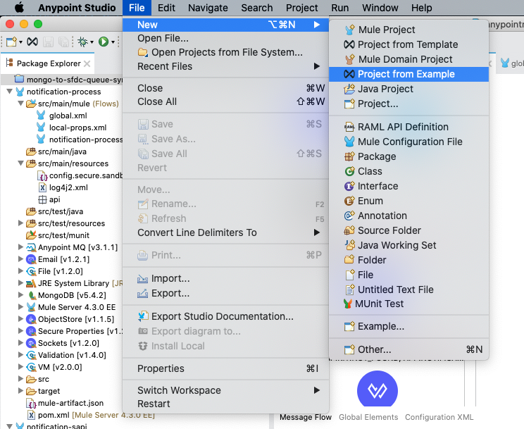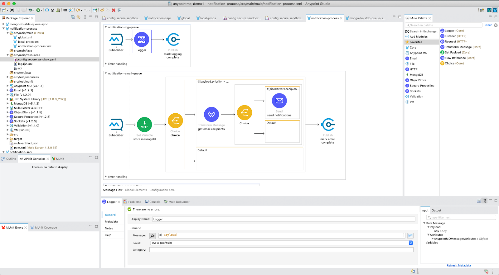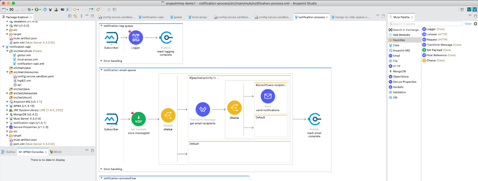 You will notice multiple flows already built out from components in the mule palette on the right-hand side of Studio. We will be making some updates to the flows based on our queues created.
