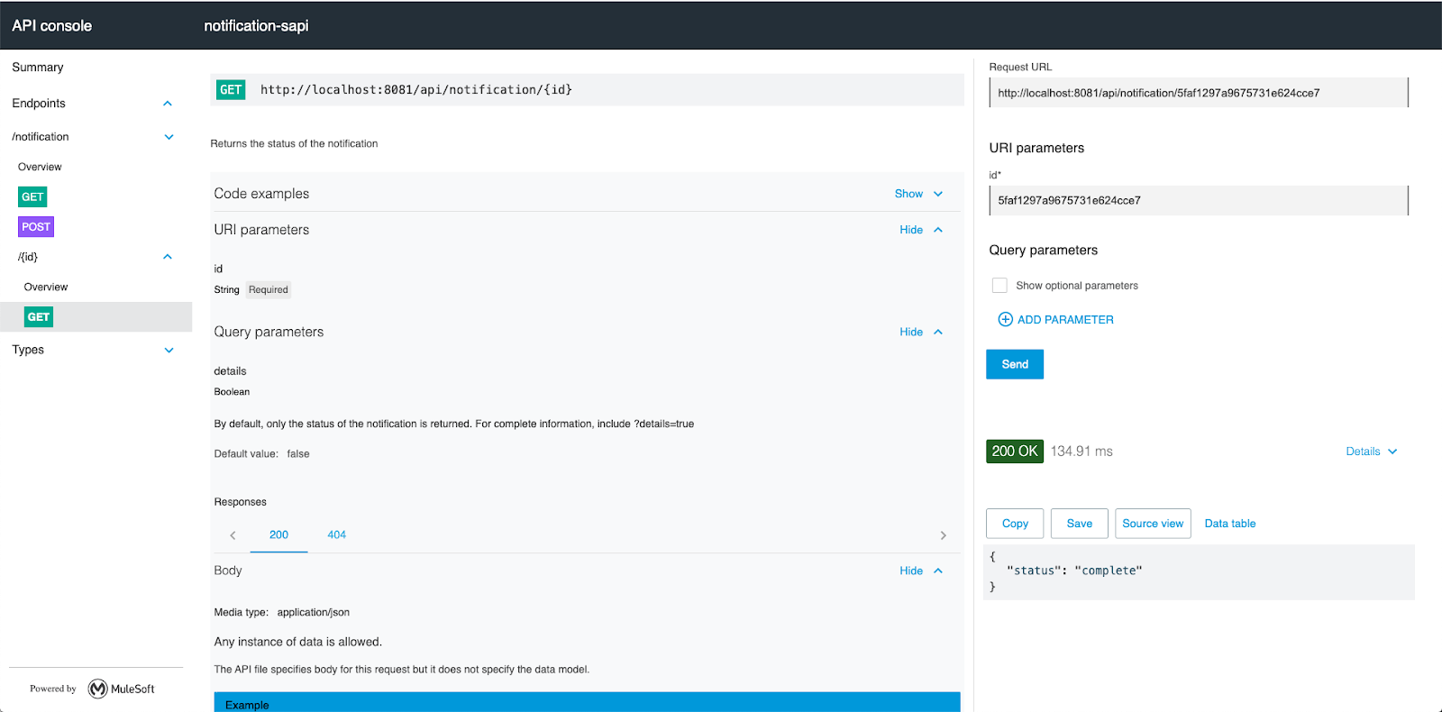 To test this, go back to your API Console and copy the ID provided. Move to the /notification/{id} GET and paste the ID into the id field. Click SEND and at this point you will see that the status was updated to "complete"