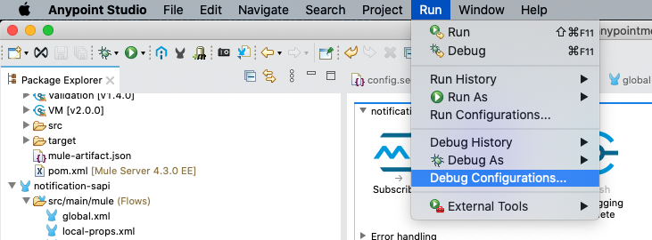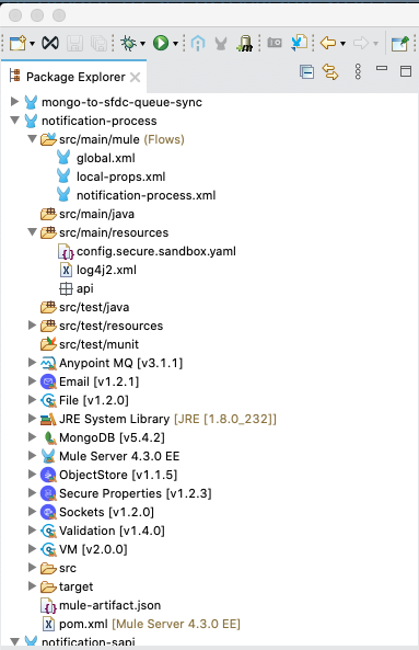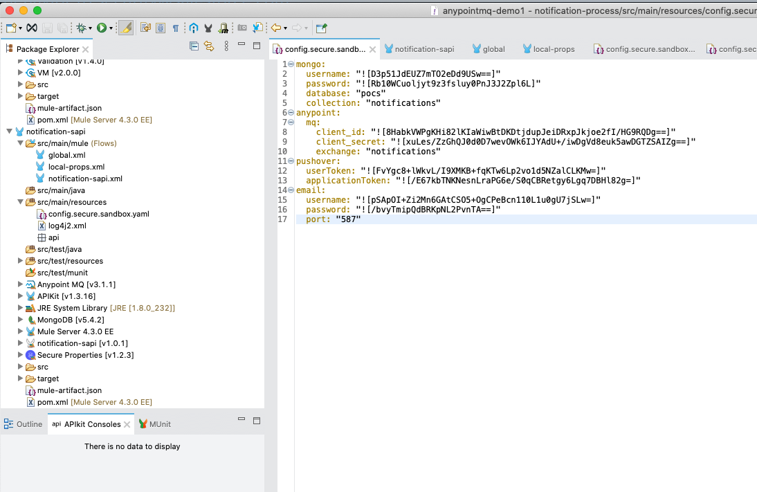 Using the package explorer on the lefthand side of your Anypoint Studio, click the project name (notification-sapi) and then open src/main/resources, and double click on config.secure.sandbox.yaml.