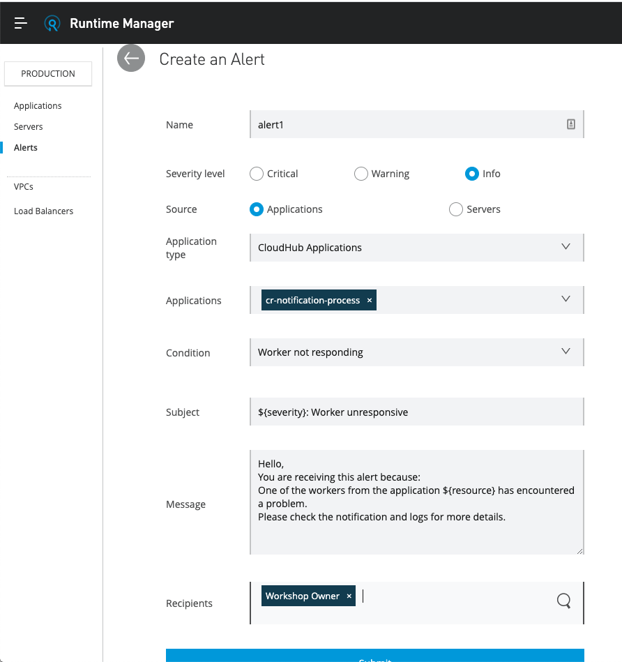 Once in Runtime Manager, you may need to move to your "Production" Environment by using the box on the left hand side. Here in Runtime Manager you can see your running applications and manage your servers and create alerts. Feel free to click around and create an alert.