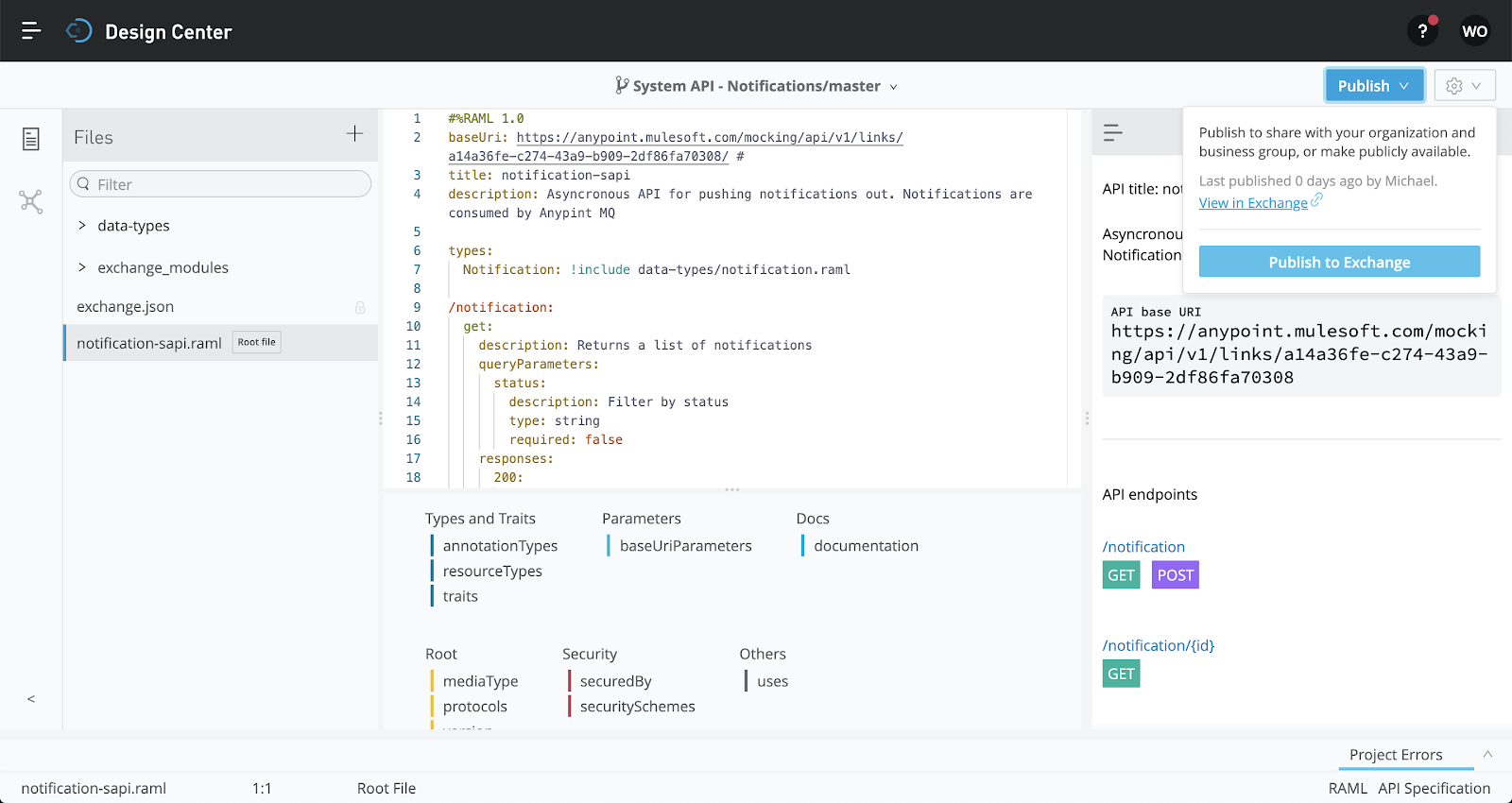 Once you are finished developing the specification, you can publish to exchange by clicking the "Publish" button on the upper right hand corner. Select "Publish to Exchange" on the drop down.