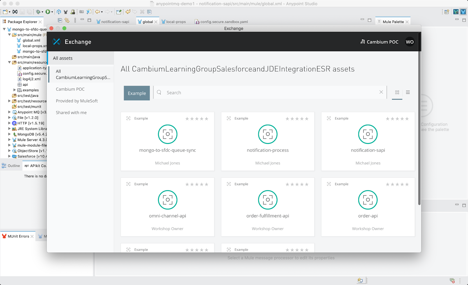In order to demonstrate mule application testing and deployment with a message queue and a database, we first have to have an actual application to work with! We will be using three examples in the workshop exchange.
