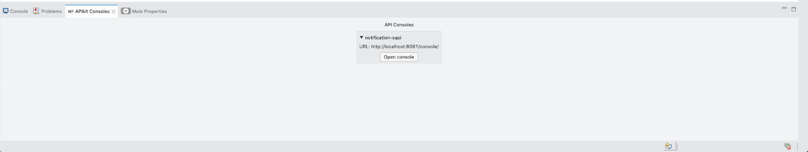 At this point, both projects are now running on an embedded mule runtime on your local machine. We will now test this project. Begin by selecting the "APIkit Consoles" tab on the bottom next to "Console" and "Problems." Then, click "Open console." This will bring you to a browser pointing to localhost.