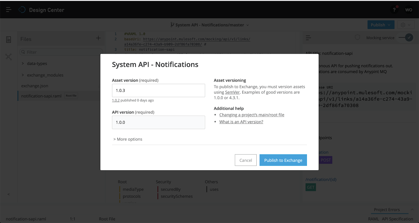 Provide an Asset Version number (1.0.0) and am API Version number (1.0.0) and click "Publish to Exchange." This will create an asset in Exchange that we can share with our team, update, document and later import into Anypoint Studio for implementation.