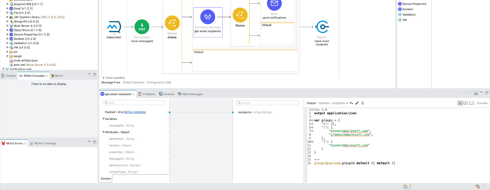 Please select the transform message titled "get email recipients." The transform message is very flexible and can be used for creating logic, mapping fields, and in this case, setting variables. Under the array titled "1," feel free to add your email address. This way, you will be notified by email when the notification is sent. Be sure to add a comma after "croebuck@mulesoft.com" and put your email address in quotation marks.
