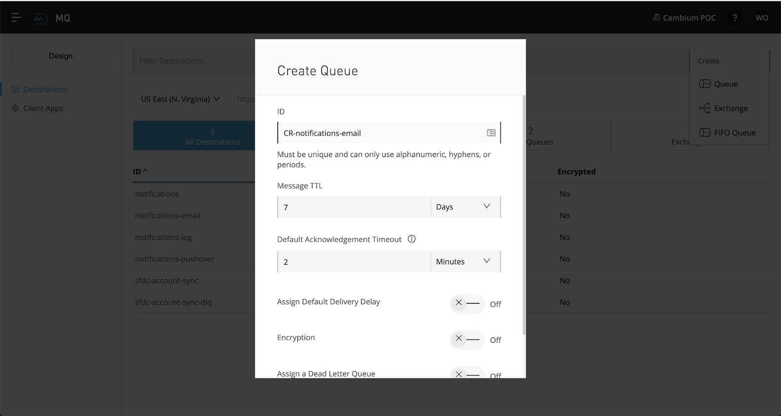 Next, click on the blue + button and FIFO queue to create another queue. Title this one as "initials-sfdc-account-sync." Then toggle the switch that says "Assign a Dead Letter Queue" to "On." Using the dropdown menu, select your deadletter queue that you created in the last step.
