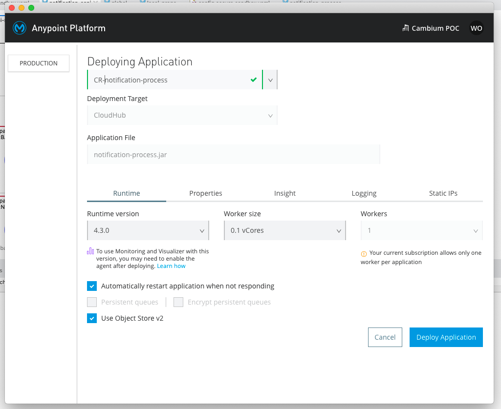 Next, change the name to "initials-notification-process." Note that we will be deploying to Mule's Managed iPaaS, CloudHub which has vertical and horizontal scaling capabilities (worker size, # of workers). Then click "Deploy Application.