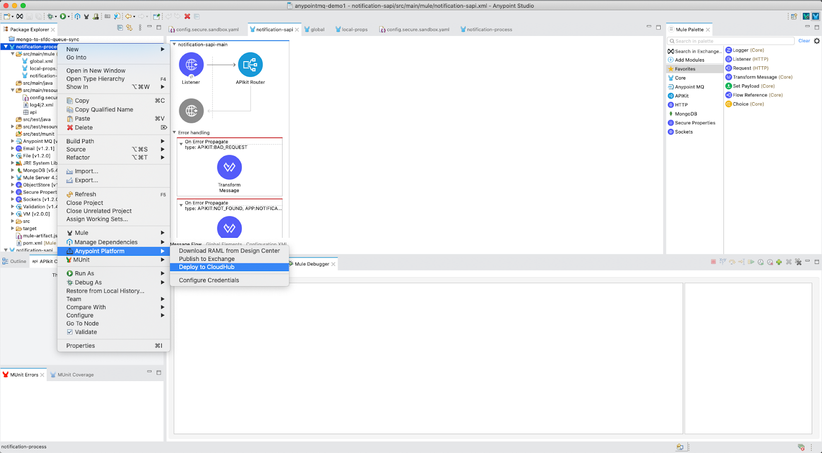 Now we will deploy the projects to CloudHub. First, right click on the project name in the package explorer. Go to Anypoint Platform -> Deploy to CloudHub