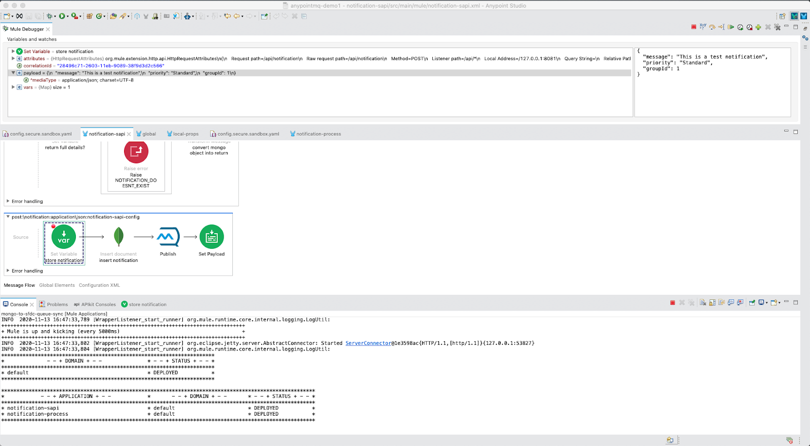 The third flow is the POST Notification, where we will create the notification. This uses a Set Variable to store the notification, the mongodb connector to insert into database, a publish component to publish to the queue, and a set payload which sets the notification ID.