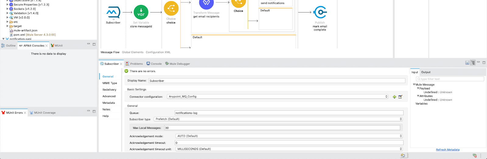 Next, we will update the email that the notification is sent to. In the notification-email-queue flow, there is a subscriber component, followed by a set variable and then a choice router. For the sake of this demonstration, we hardcoded the emails into a transform message.