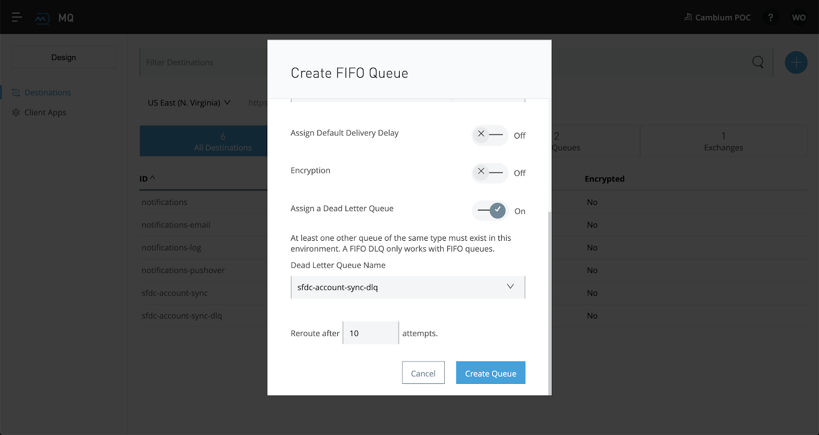 Next, click on the blue + button and FIFO queue to create another queue. Title this one as "initials-sfdc-account-sync." Then toggle the switch that says "Assign a Dead Letter Queue" to "On." Using the dropdown menu, select your deadletter queue that you created in the last step.